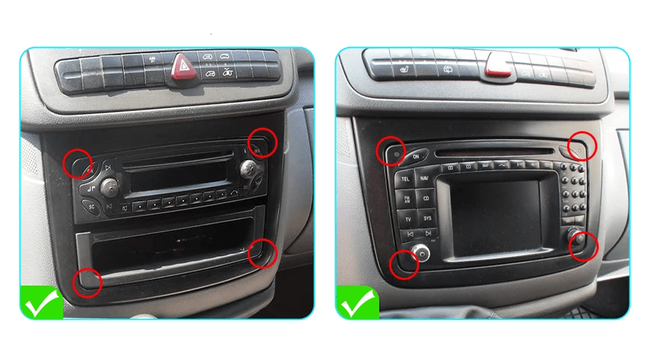 Geschikt voor auto's met originele radio rond hoeken. Als de radio rechte hoeken heeft, gebruik dan dit: Vito W639 (vierkant)